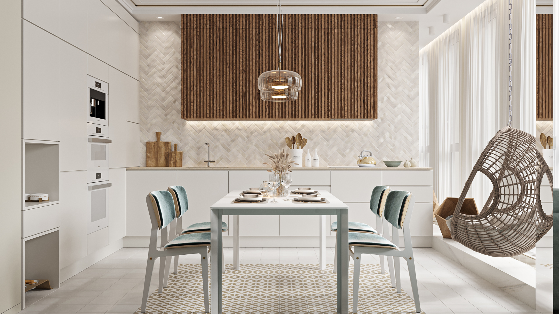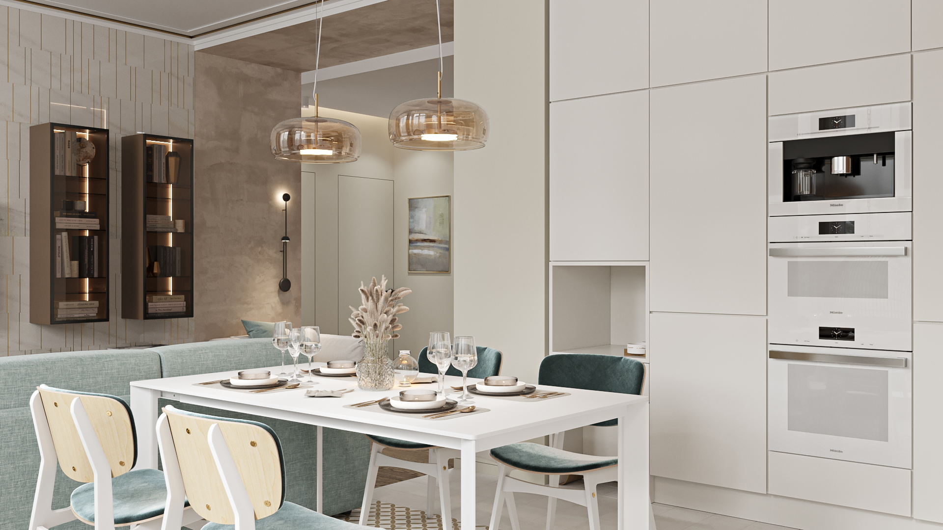 Просторная квартира, с чудесными панорамными окнами и видом с высоты птичьего полета. Площадь помещения более 150 квадратных метров, на которых проживает дружная семья: мама, папа и дочка. Архитектурой дома задаются плавные линии, которые отразились в самом главном пространстве квартиры - зоне столовой и гостиной. Проект был тщательно продуман и проработан так, что бы восприятие от интерьера было легким, комфортным, но при этом достойным и интересным. Применяли оригинальные приемы с использованием разных отделочных материалов. Есть элементы индустриального стиля. В основном, палитра умеренная, спокойная, но с использованием акцентного цвета. Так, в кухне-гостиной, присутствует насыщенный сине-изумрудный цвет, который дополнен пудровым сливочным оттенком. Богатство текстур: дерево, металл, бархат, глянец, лепнина, в сочетании с роскошным освещением - наполняют интерьер особым шармом.