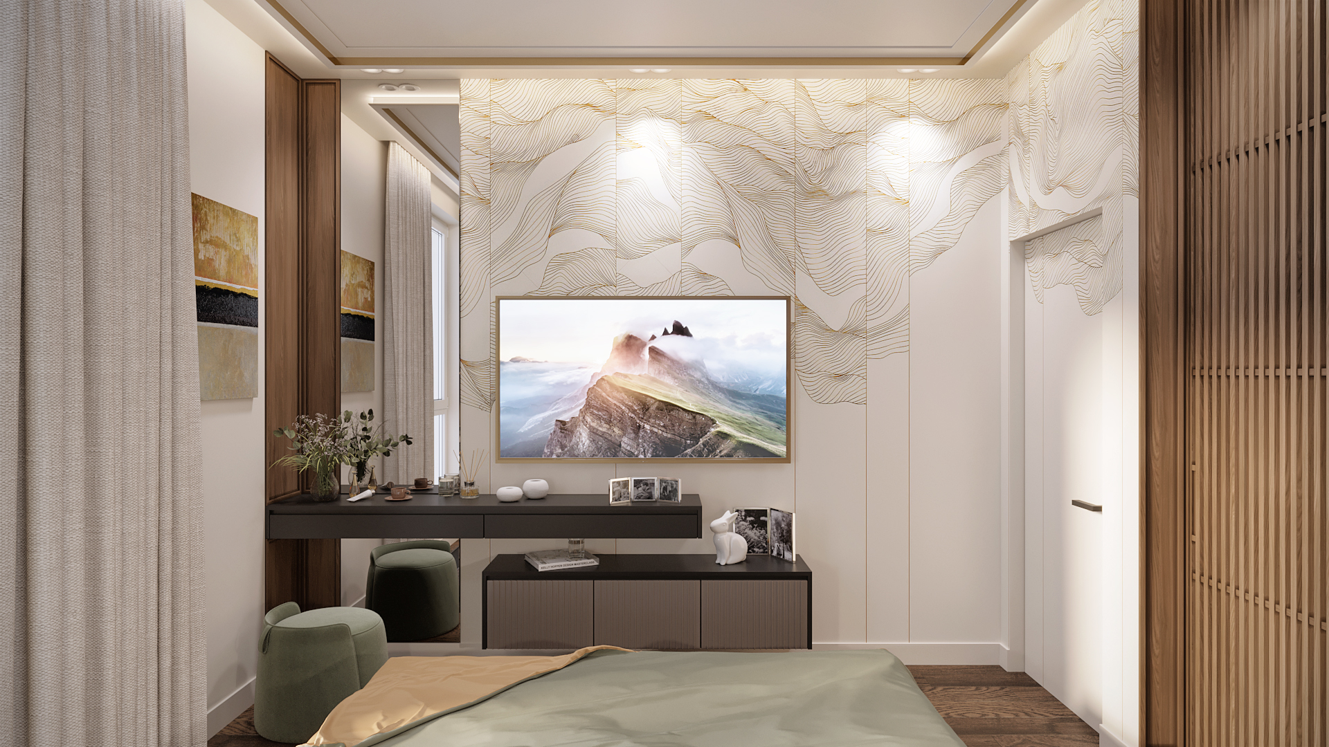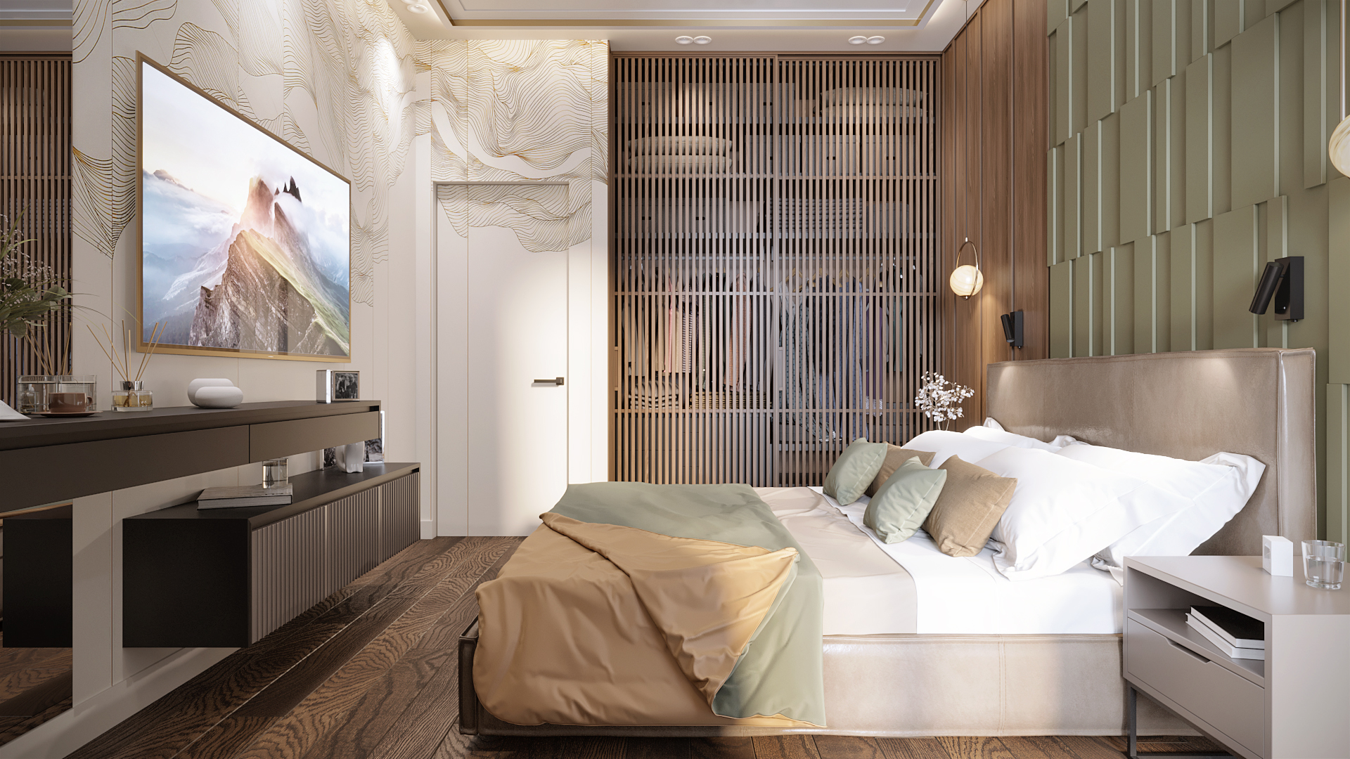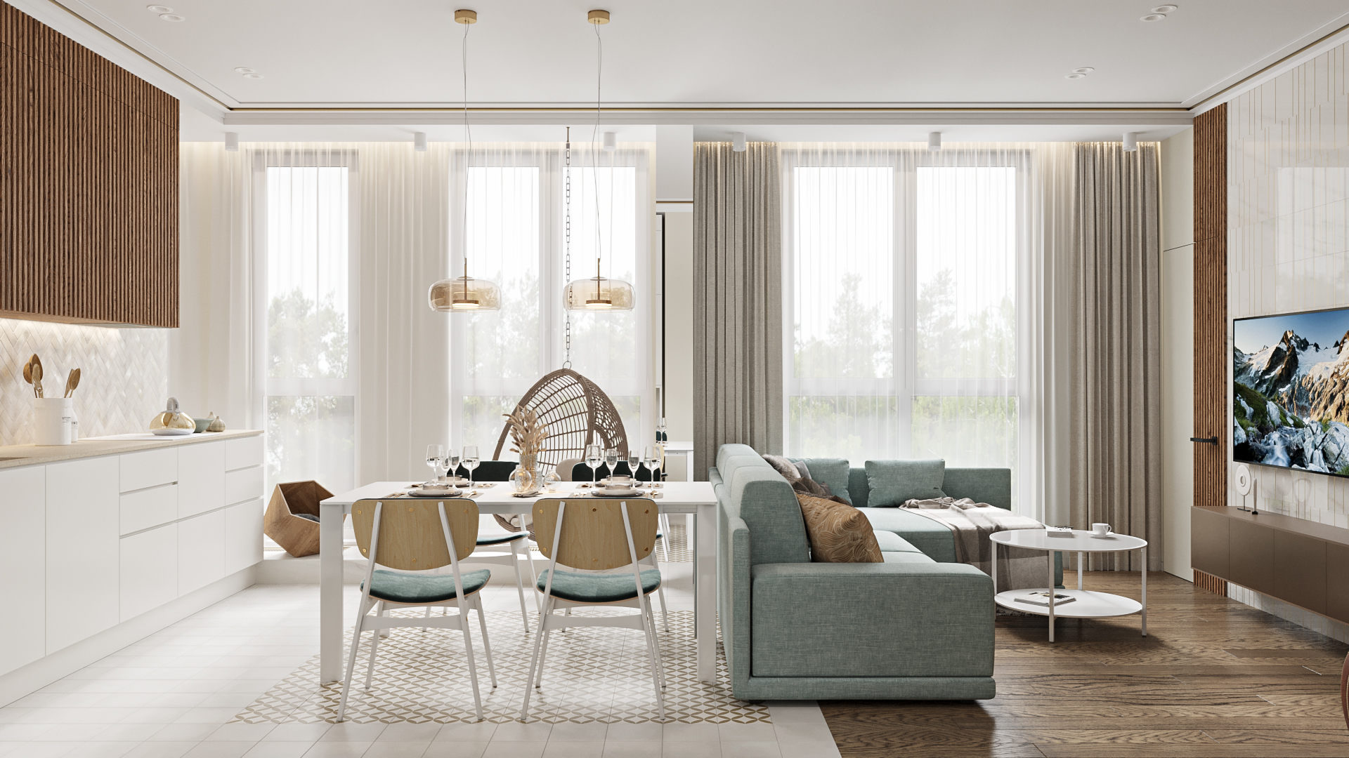 Проект был подготовлен для молодой пары с малышом. Квадратура позволила расположить две спальные комнаты, два санузла, отдельную гардеробную при входе в квартиру и конечно просторное, светлое, единое пространство кухни-гостиной. Наличие больших панорамных окон значительно сузило количество вариантов планировок, но нам удалось сбалансировать эргономику и дизайн. Окна наполняют помещения дневным светом, а в вечернее время дают великолепную видовую панораму. Высокие потолки дают ощущение простора. Интерьер подобран в светлых тонах, в современном стиле. Акцентным оттенком является оливково-травяной, который украшает и успокаивает. Осветительные приборы подчеркивают объем пространства и выделены черным цветом. В итоге у нас получился современный, комфортный и уютный дом для дружной семьи.
