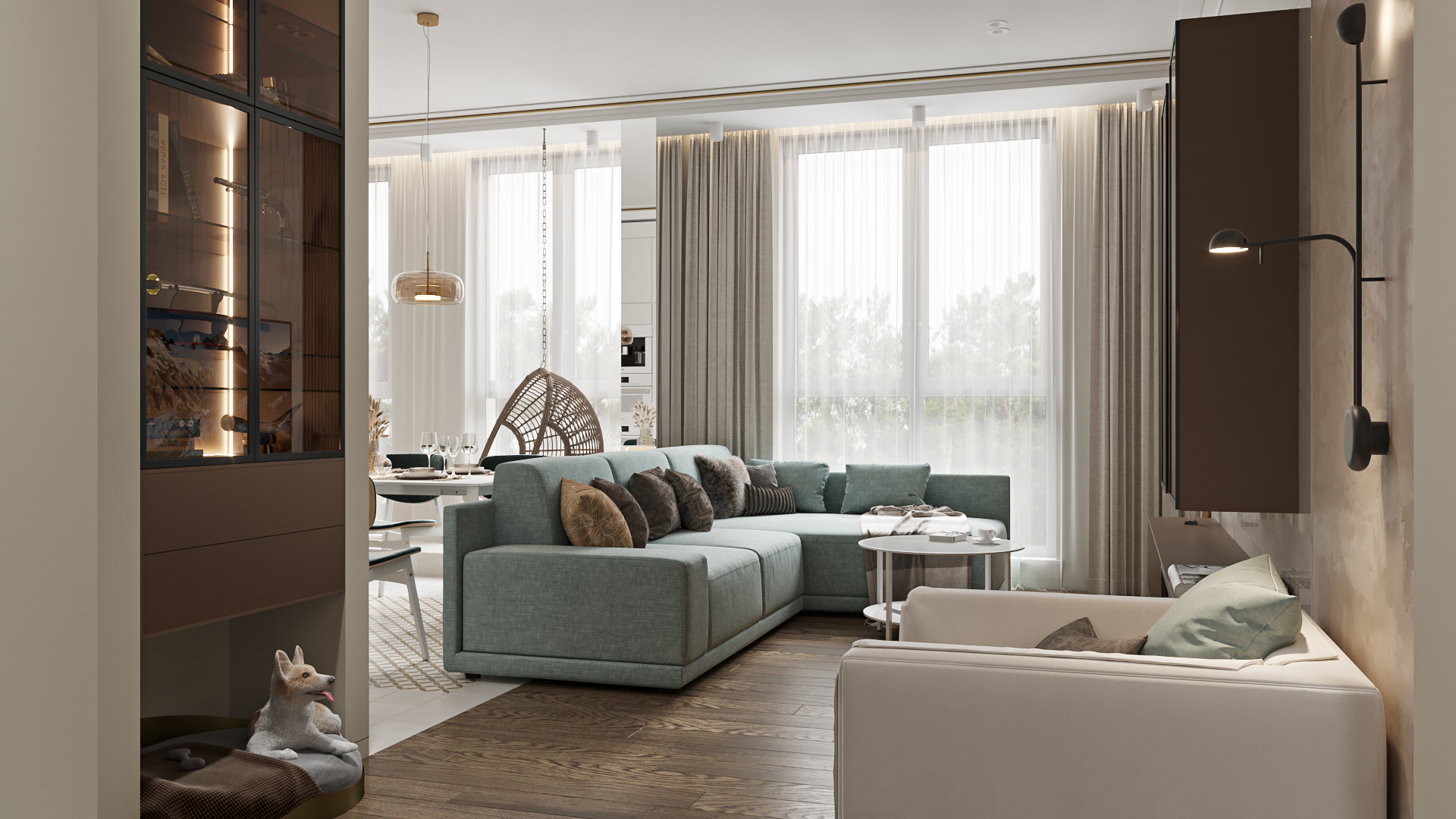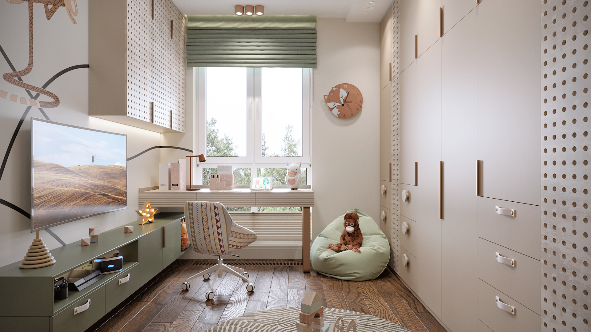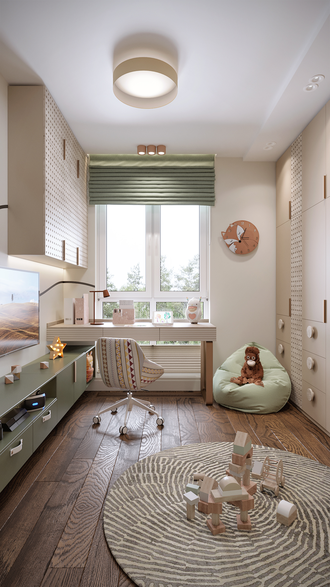 Общим настроением интерьера стали спокойные природные оттенки. Оригинальные приемы в оформление стен, отделке и предметов мебели создают уникальное пространство. Грамотное распределение пространства позволяет всем домочадцам с комфортом проводить время вместе и при желании уединиться в своих комнатах. Эта квартира расположена в прекрасном жилом комплексе “Лес”. Название выбрано не случайно, выйдя на балкон из гостиной, можно погрузиться в песнопения птиц и лицезреть лесной массив до горизонта.