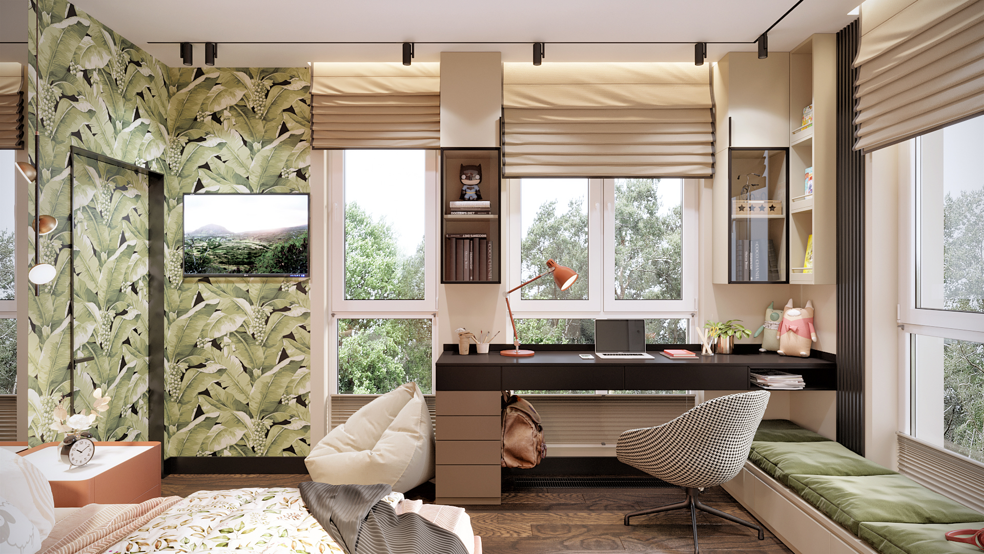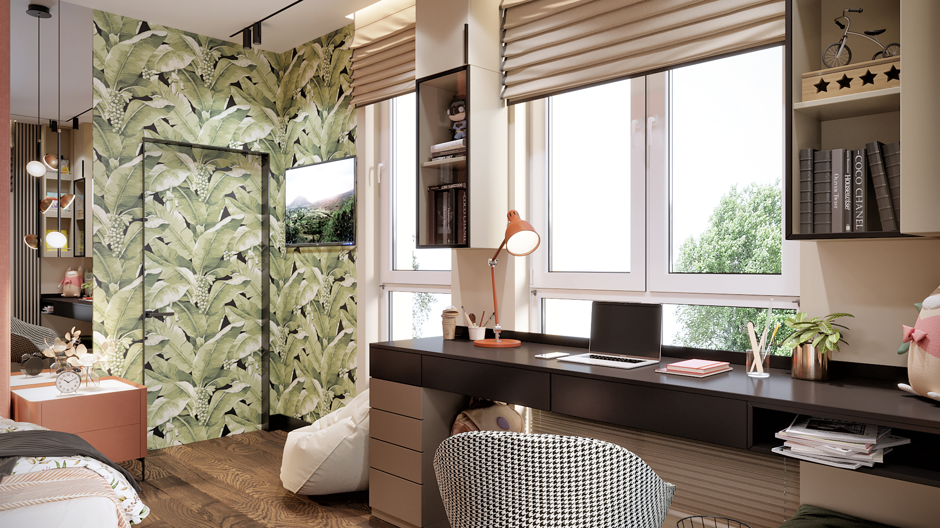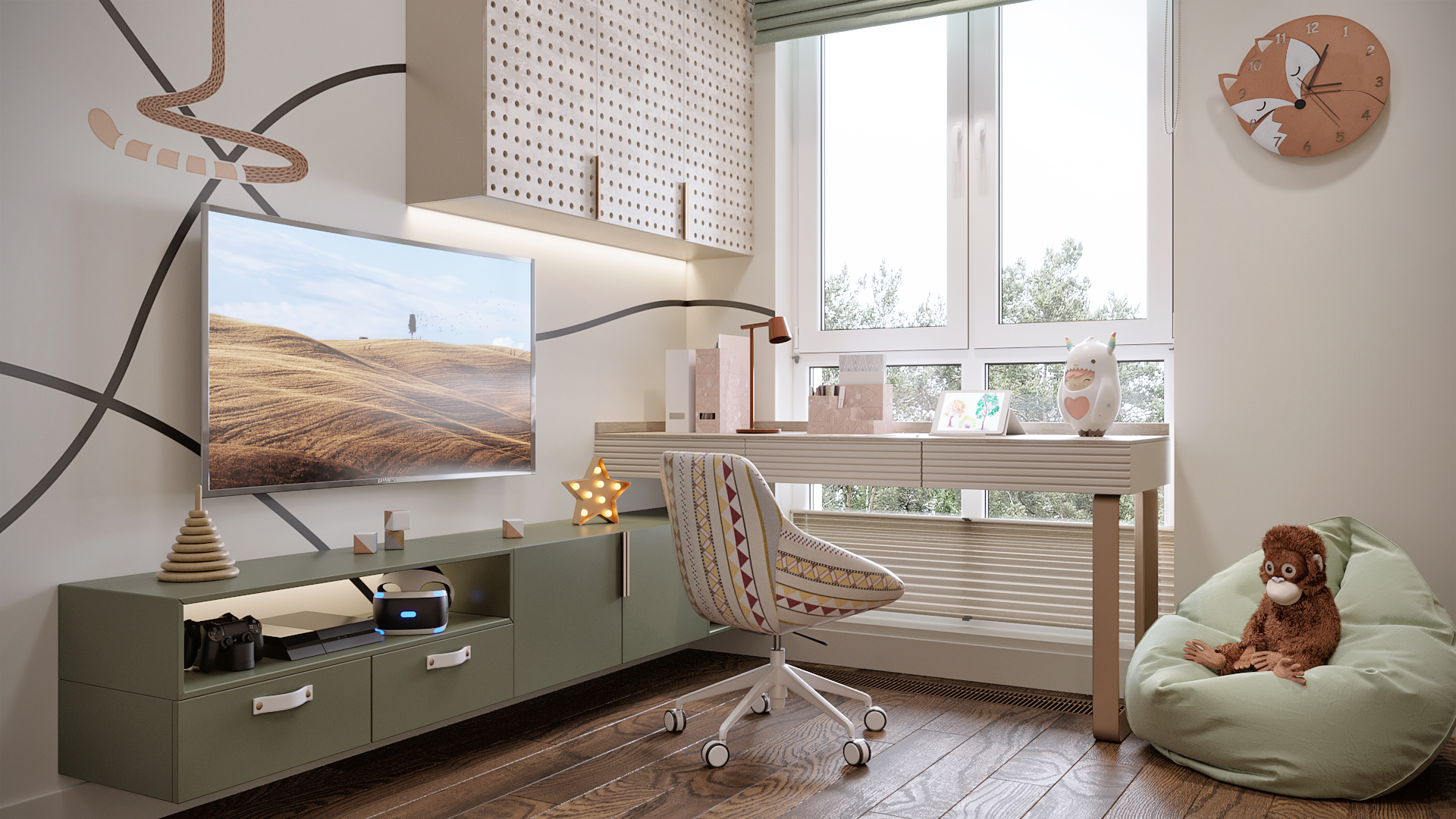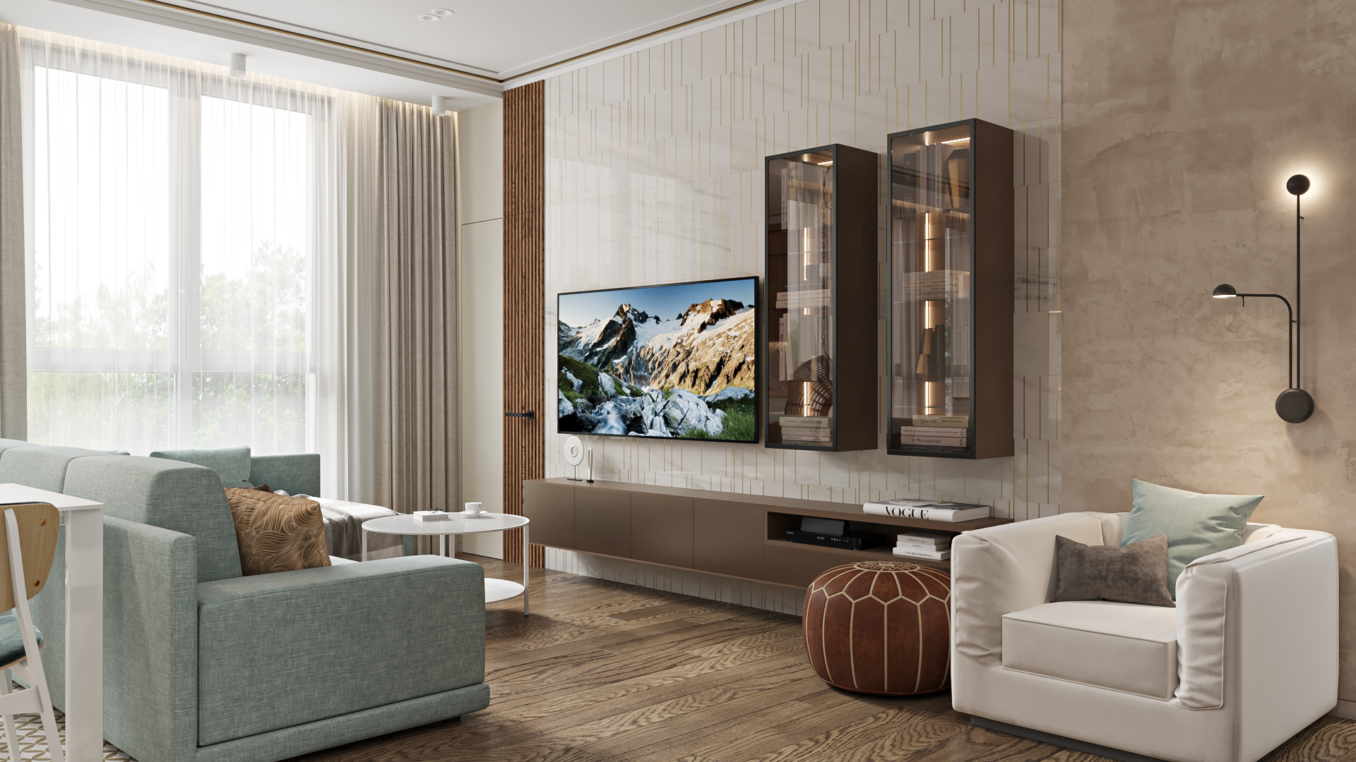 Общим настроением интерьера стали спокойные природные оттенки. Оригинальные приемы в оформление стен, отделке и предметов мебели создают уникальное пространство. Грамотное распределение пространства позволяет всем домочадцам с комфортом проводить время вместе и при желании уединиться в своих комнатах. Эта квартира расположена в прекрасном жилом комплексе “Лес”. Название выбрано не случайно, выйдя на балкон из гостиной, можно погрузиться в песнопения птиц и лицезреть лесной массив до горизонта.