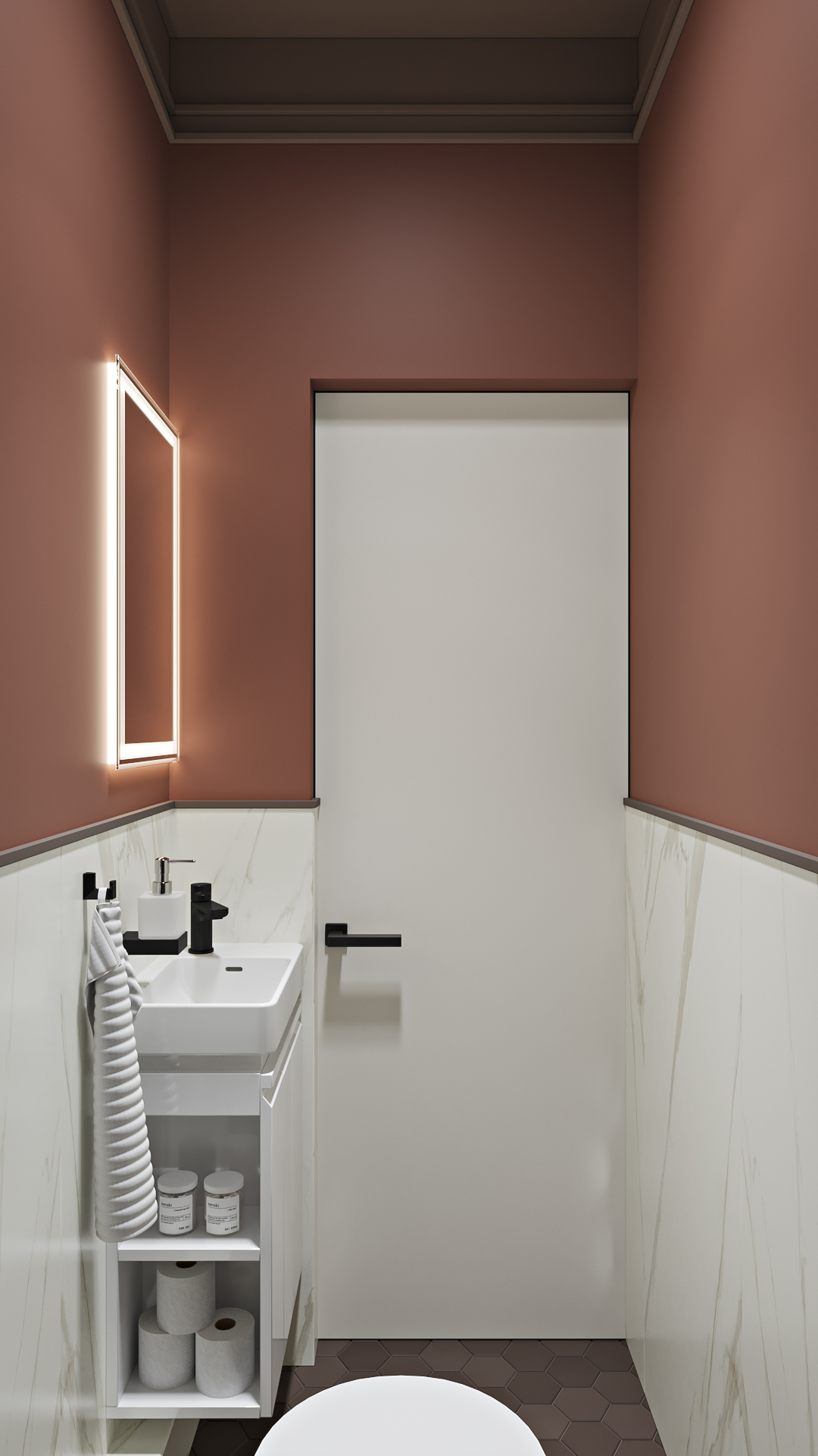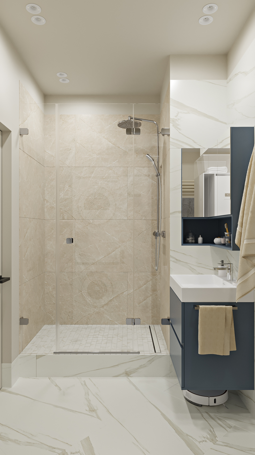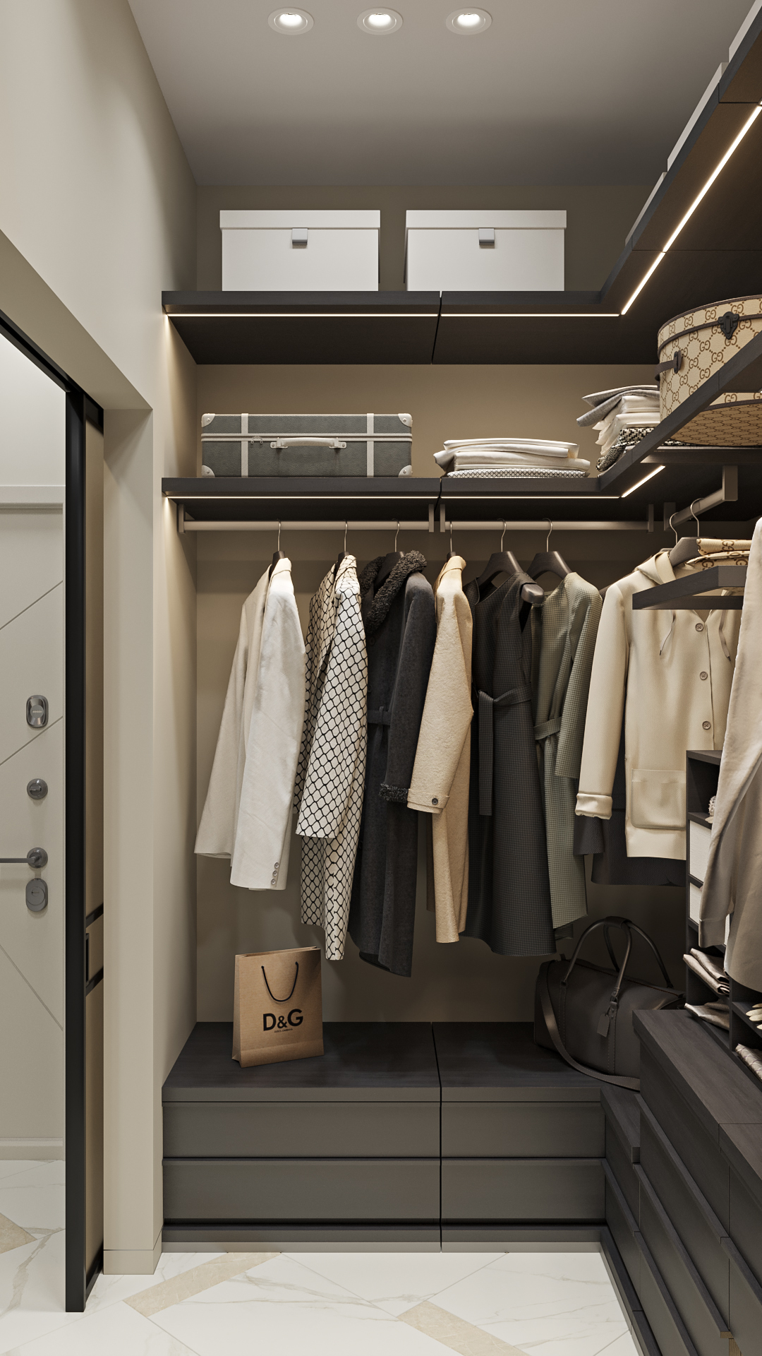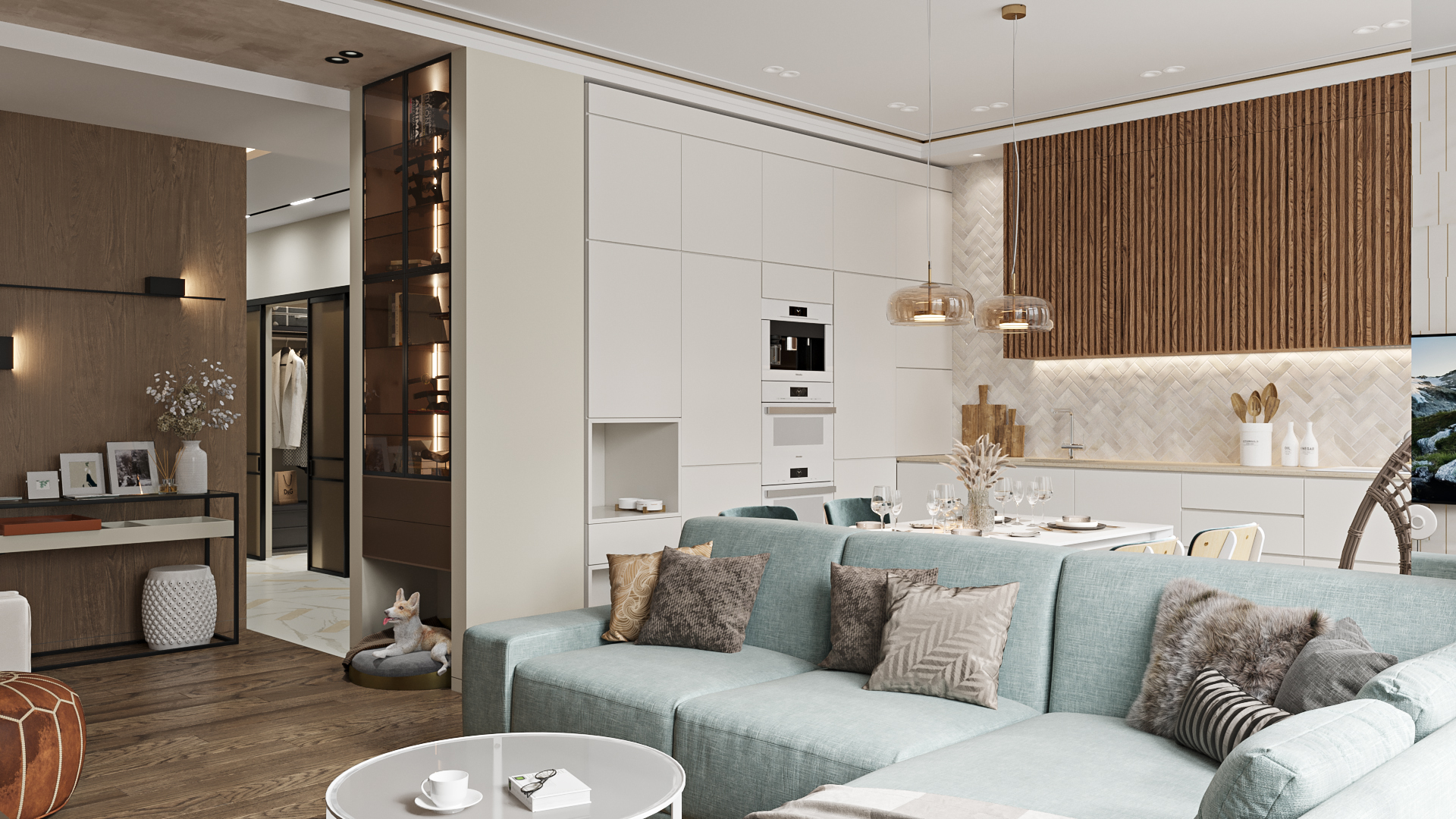 Планировочное решение позволило нам отделить приватную зону от входной. При входе в квартиру, мы попадаем в светлое и открытое пространство, видим мягкую зону для отдыха, которая сразу располагает к определенным ассоциациям. Система хранения не навязчива и от этого пространство смотрится легко. Кухня и гостиная находятся в одном пространстве, но при этом есть возможность их разделить сдвижной стеклянной дверью. Грамотная перепланировка позволила нам расположить во входной зоне отдельную гардеробную и гостевой санузел, что несомненно повышает уровень комфорта.