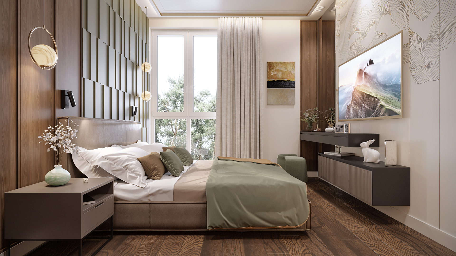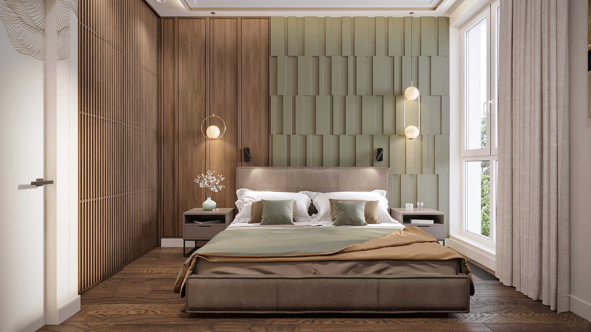 Например, в хозяйской спальной комнате, мы использовали строгую немецкую мебель, в сочетание с изящной мебелью из массива, выполненная по моим эскизам на заказ. Акцентом стала стена в изголовье кровати, выкрашенная в сложный зеленый цвет - это последний тренд.
