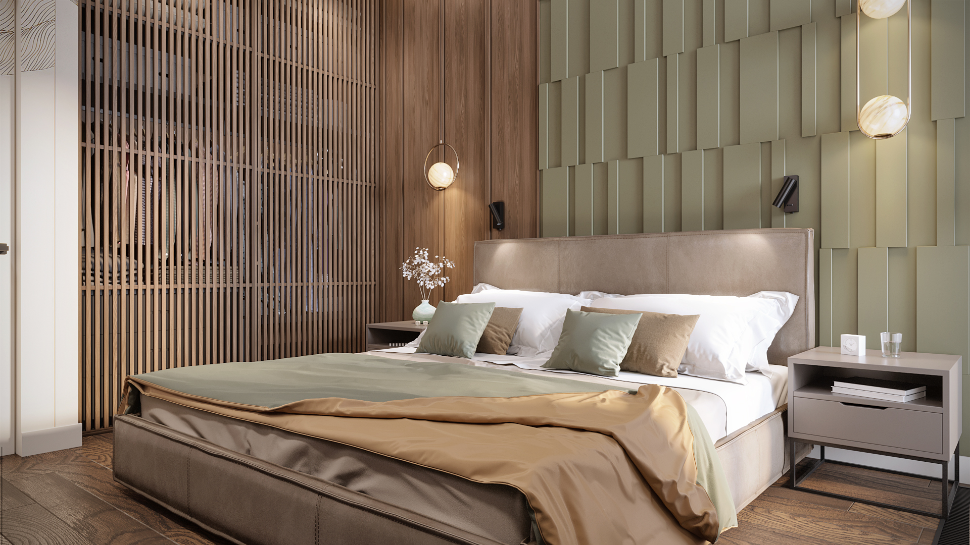 Спальные комнаты выполнены в более спокойных тонах, но с яркими акцентами в виде настенных панно. Мебель легкая и ненавязчивая. В хозяйской спальне присутствует немного этнических мотивов, для создания необходимого настроения для отдыха.