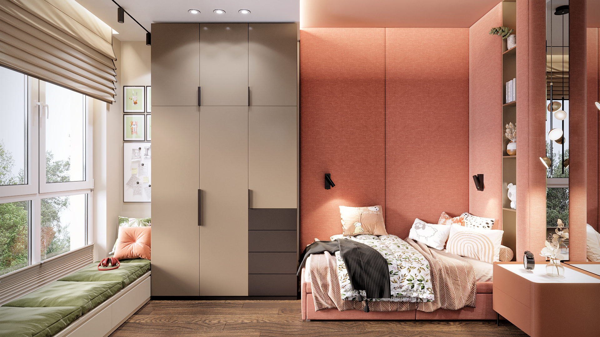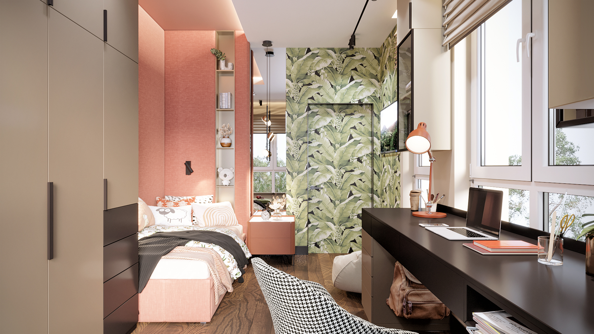 В комнате старшей дочери также присутствует шкаф немецкого производителя. По соседству с ним - уникальная мебель, выполненная из известного уже всем ОСП и покрытая глянцевым лаком. По колористике - комната наполнена оттенками розового в сочетании с чёрным и древесным оттенком.