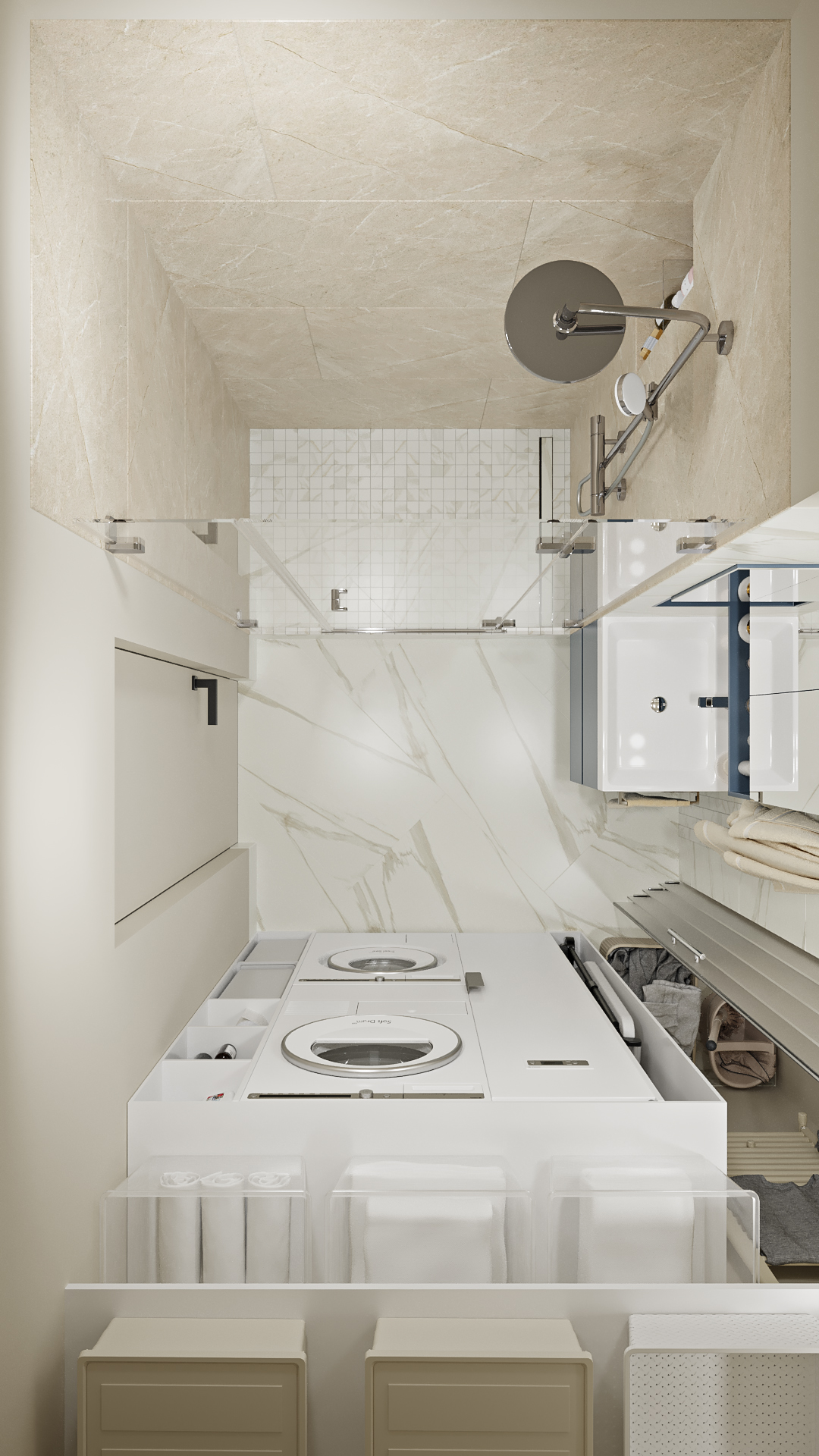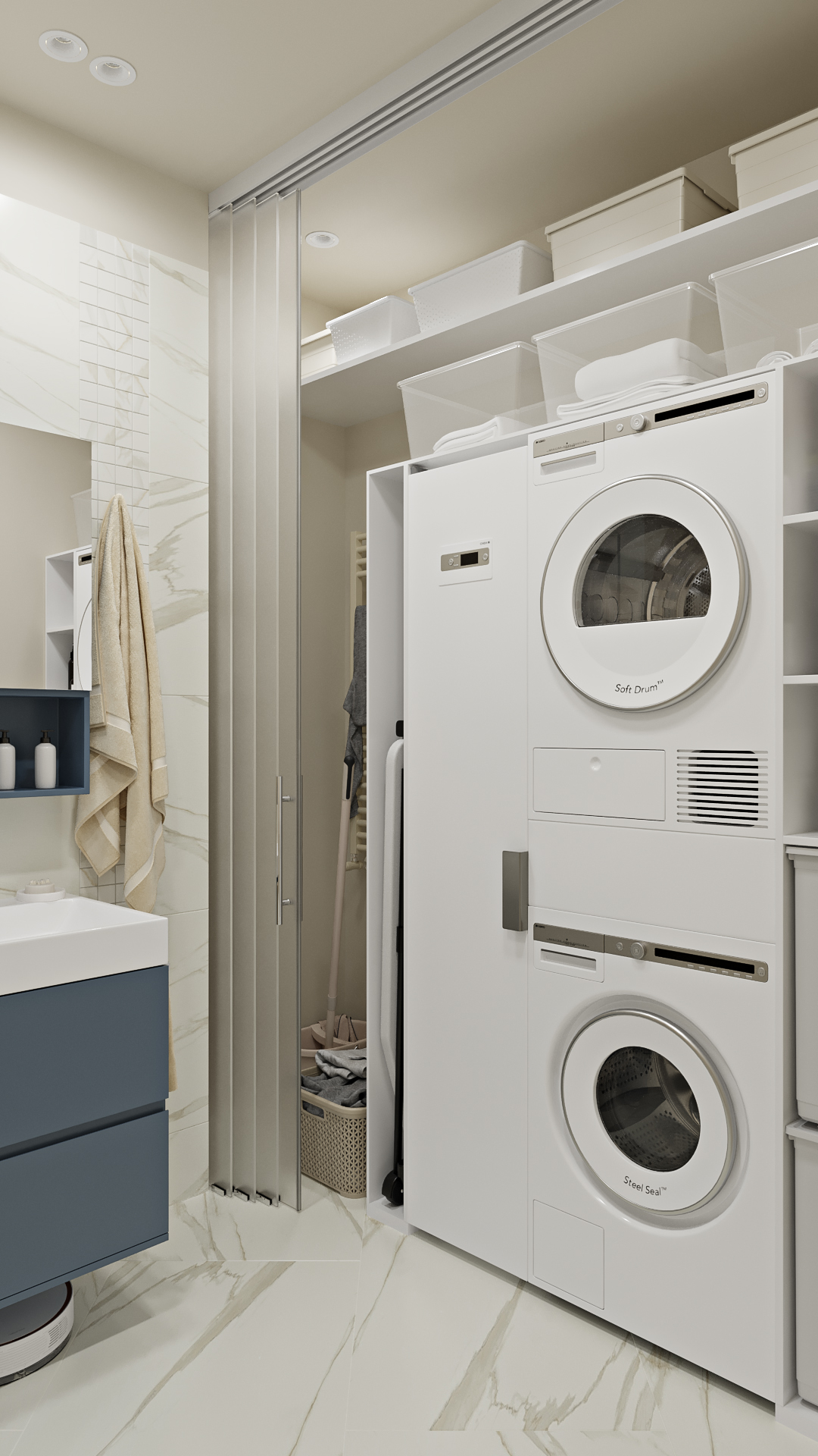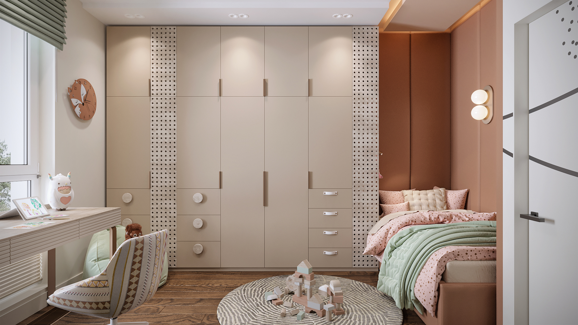 Просторная и светлая квартира для дружной семьи с двумя детьми и домашними животными. Общее пространство занимает просторная гостиная с кухонной зоной. Из гостиной можно попасть в приватную мастер спальню с санузлом и гардеробной. У детей есть персональные просторные комнаты, которые расположены в другой части квартиры. Также предусмотрен гостевой санузел и детская ванная комната. Связующим звеном в квартире является длинный коридор, который начинается входной группой и заканчивается детской ванной комнатой. Вдоль всего коридора организовано различное хранение: при входе подвесной шкаф с удобным хранением обуви;в центральной части расположен неглубокий шкаф с различным хранением; в завершение, за двумя распашными дверьми, организована постирочная зона.