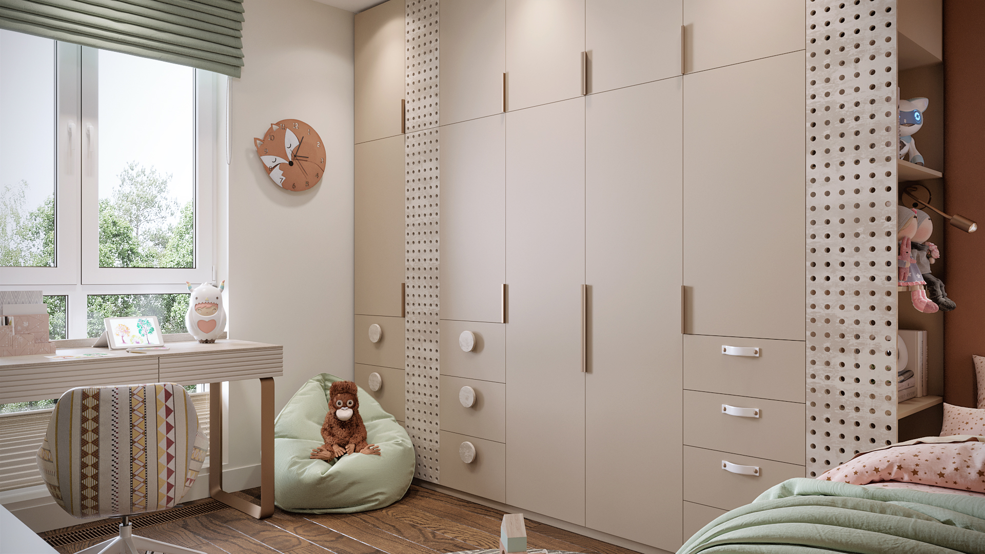 Из-за особенности “Г-образной” планировки, получилась приличная площадь коридоров. Этого нельзя избежать, но возможно использовать с толком. Так, например, в коридоре в детской стороне мы разместили пятиметровый гардероб и шкаф купе со скрытым хоз.блоком.
